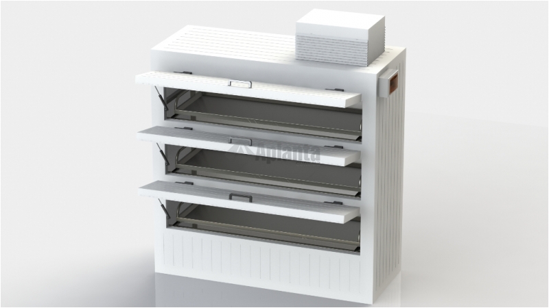 Камера холодильная для морга боковая трехместная рассчитана на временное размещение тел усопших. В конструкцию устройства входит три термобокса, каждый из которых содержит стеллаж из прочной нержавеющей стали, оборудованный носилками с четырьмя рукоятками, и холодильный агрегат французского производителя L’unite Hermetique, который смонтирован на крыше термобокса. Термоизоляционный эффект бокса достигается сочетанием трехслойных сэндвич-панелей из стали с полимерным покрытием и пенополиуретанового наполнителя, который поддерживает внутренний микроклимат. Носилки из нержавеющей стали оборудованы тремя парами колес, обеспечивающих удобную транспортировку. В зависимости от условий, в которых монтируется камера, холодильный агрегат может быть размещен за камерой или за стеной помещения.