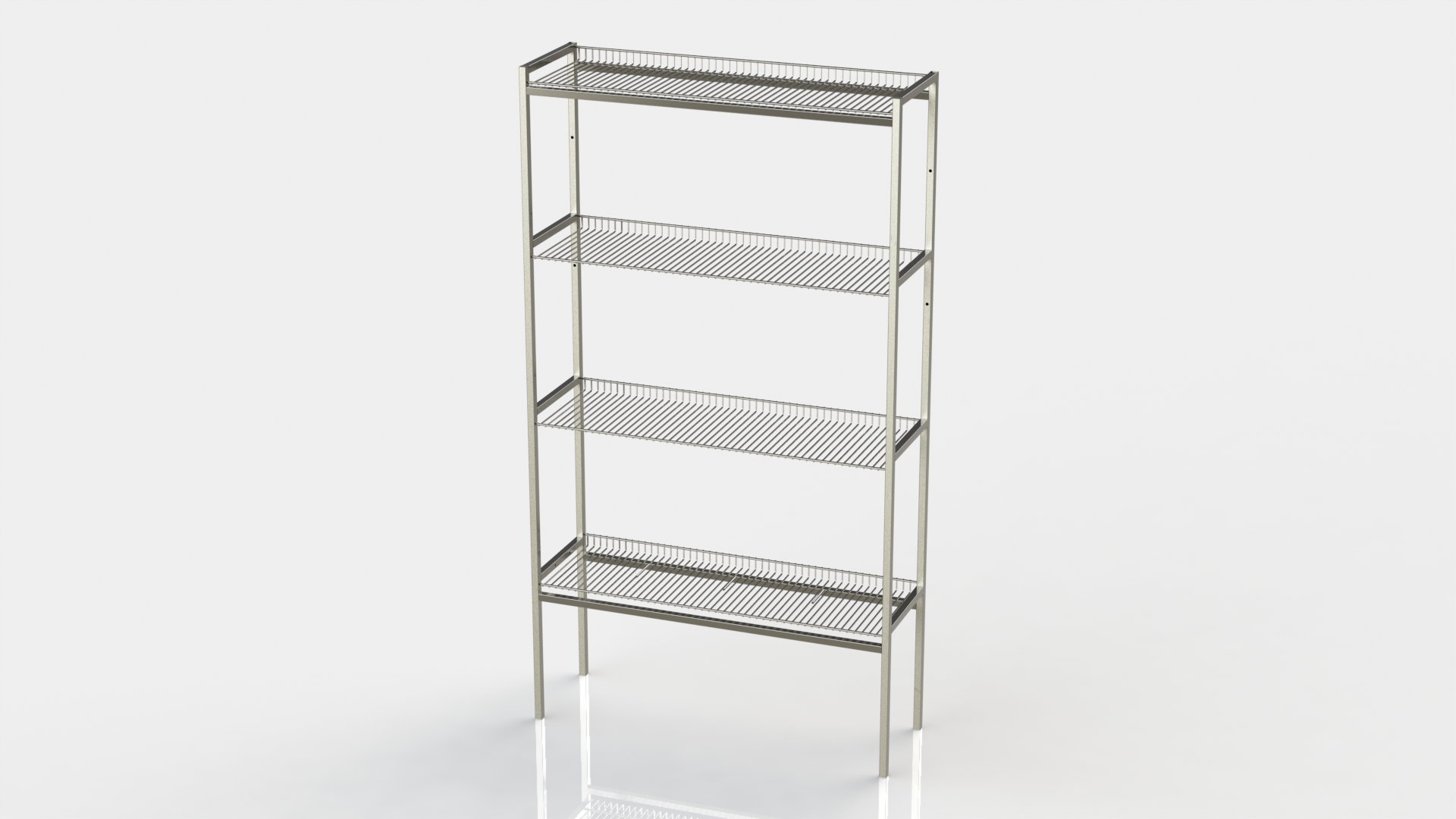 Цельносварная конструкция металлического стеллажа обеспечивает постоянную воздушную циркуляцию и включает в себя профильный каркас 20х20 мм и несколько стеллажных полок с различным назначением. Полки из листа перфорированной нержавеющей стали AISI 304 предназначены для сушки стаканов, полки из нержавеющего прута диаметром 3 мм - для сушки тарелок.