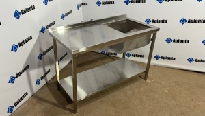 Обычно стол-ванна располагается в овощном, рыбном, мясном и прочих отделениях профессиональных кухонь предприятий общепита. Помимо столешницы из пищевой нержавеющей стали и вместительной моечной ванны, глубина которой составляет 300 мм, конструкция промышленного стола дополнена полкой. Помимо непосредственного промывания продуктов, мойка используется как емкость для набора воды.