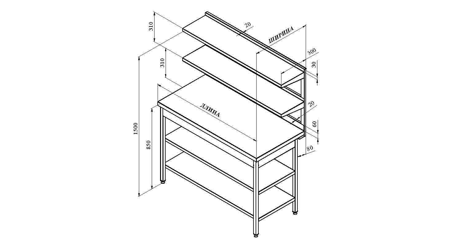 Стол производственный с двумя полками и двумя дополнительными полками – это отличное решение для профессиональных кухонь, ресторанов, столовых и других заведений общественного питания, где важно оптимизировать рабочее пространство и обеспечить удобство хранения. Является элементом линий раздачи питания. Помимо столешницы из нержавеющей стали AISI 201 и каркаса из профильной трубы, конструкция разделочного стола дополнена двумя нижними полками и двумя верхними. Нижние полки разделочного стола укреплены внутренним профилем. Верхние полки надстройки выполнены из нержавеющей стали.