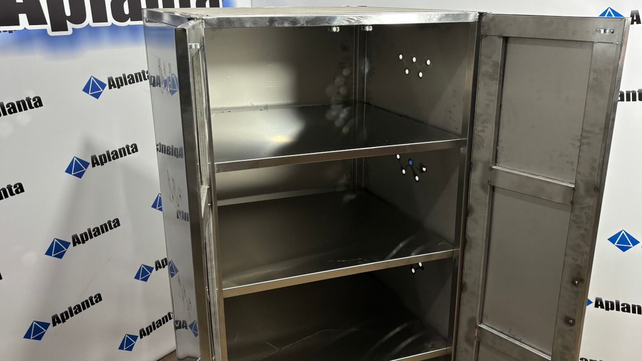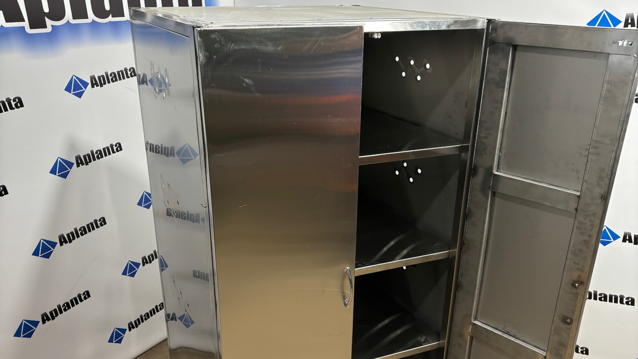 Конструкція шафи для зберігання посуду передбачає чотири полиці, що дозволяє розмістити посуд, каструлі, сковороди та інший кухонний інвентар. Нержавіюча сталь надає шафі міцності та забезпечує легкий догляд. Це дозволяє підтримувати високий рівень чистоти, що особливо важливо на професійній кухні. Металева шафа для посуду оснащена дверцятами, які забезпечують зручний доступ до вмісту і захищають посуд від забруднень і пилу.