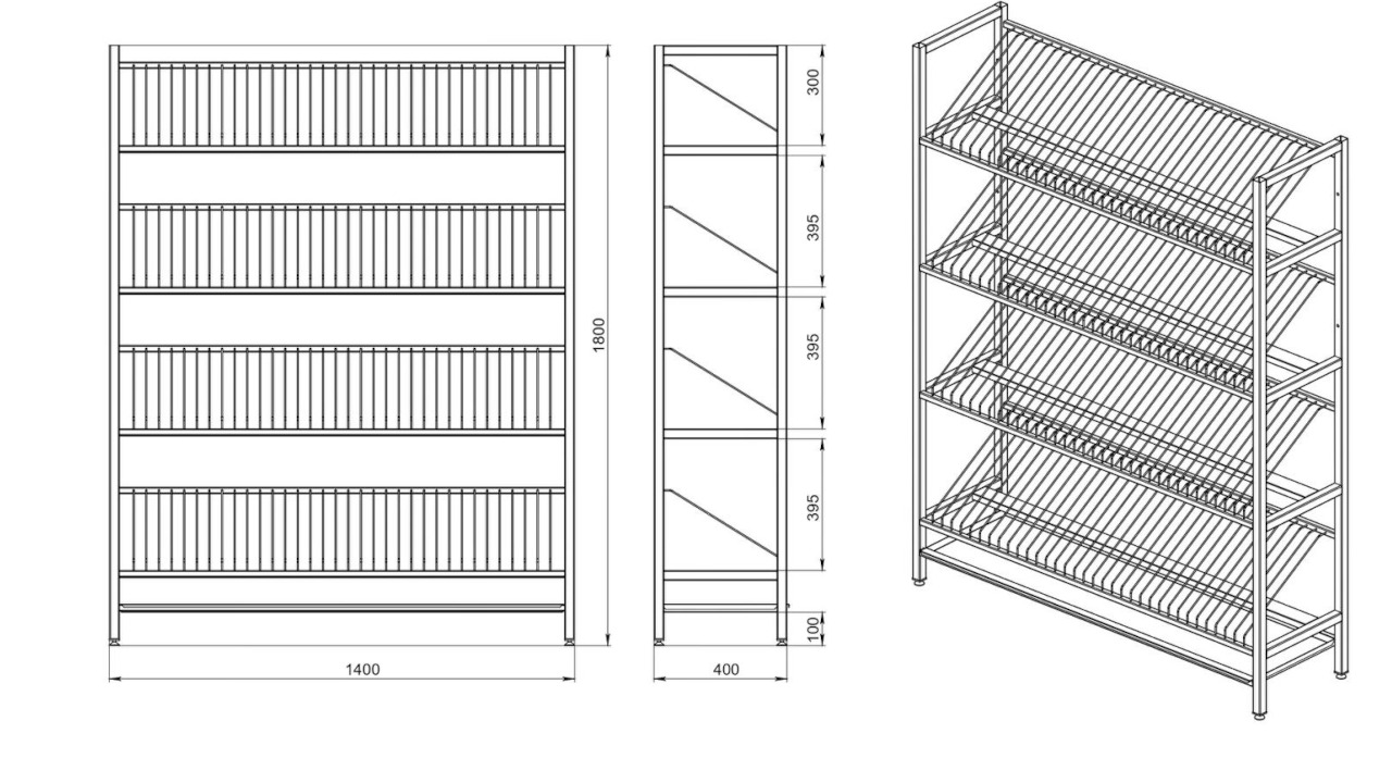 Нержавіючий стелаж призначений для зручного зберігання, сушіння та систематизації підносів та деко у професійних кухнях, харчоблоках та медичних закладах. Конструкція забезпечує порядок, гігієнічність та швидкий доступ до інвентарю.
